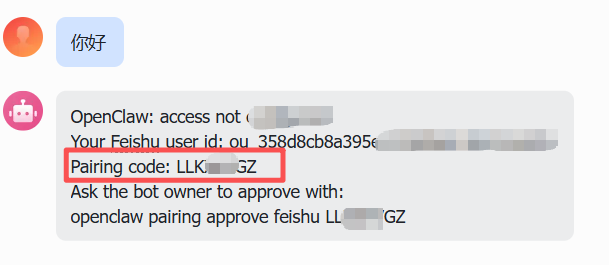 openclaw pairing approve feishu <配对码>批准后即可正常对话。